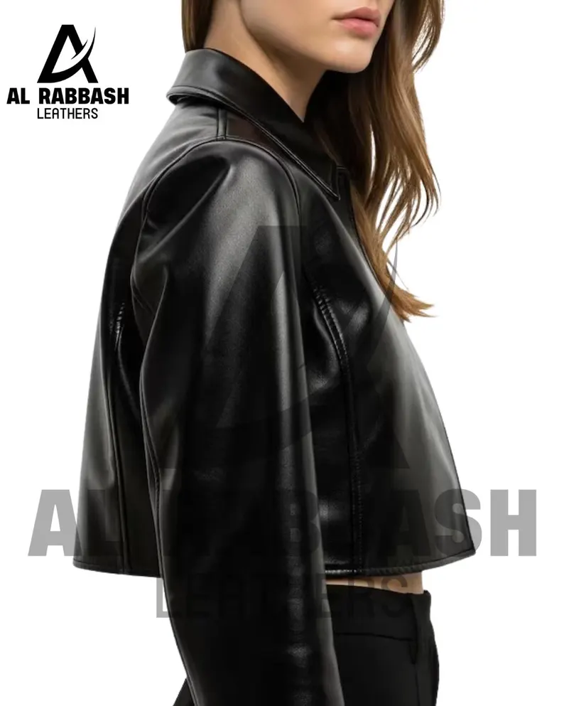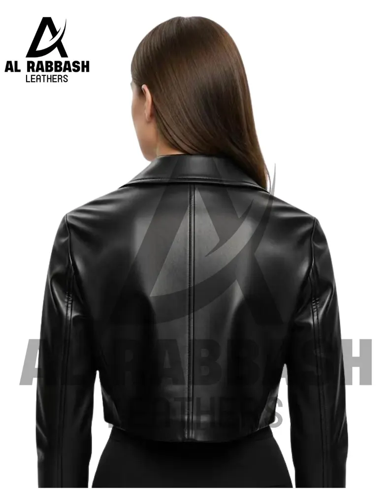 Experience luxury and style with our Custom Black Cropped Leather Jacket, a statement piece that redefines modern fashion. Crafted from premium glossy genuine leather, this jacket combines elegance, edge, and craftsmanship in one bold silhouette. Its tailored cropped cut flatters the waistline, while sharp lapels and clean stitching reflect superior design and attention to detail.