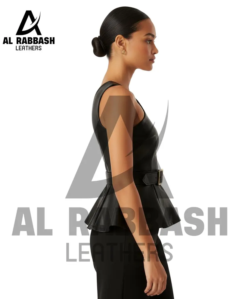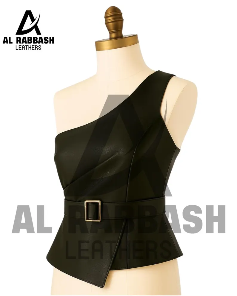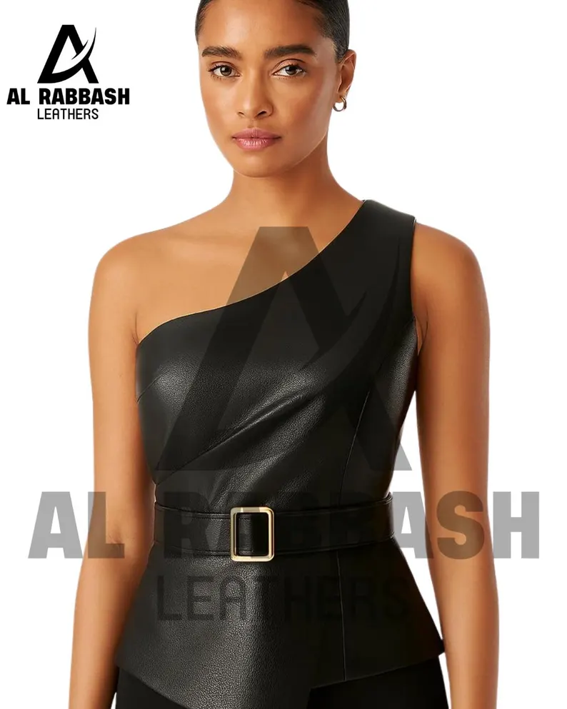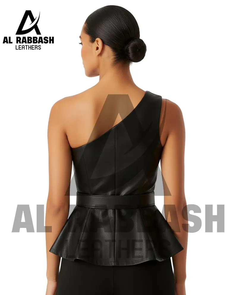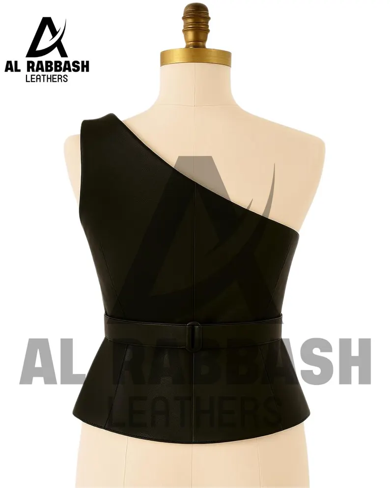 The asymmetrical one-shoulder design adds a bold edge, while the belted waist and peplum silhouette beautifully accentuate your figure, creating a refined hourglass shape. Its smooth inner lining ensures lasting comfort, and every stitch reflects the skill and dedication of our expert leather artisans.