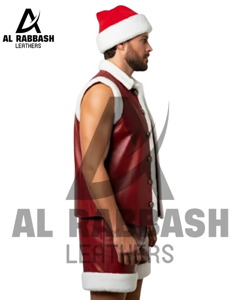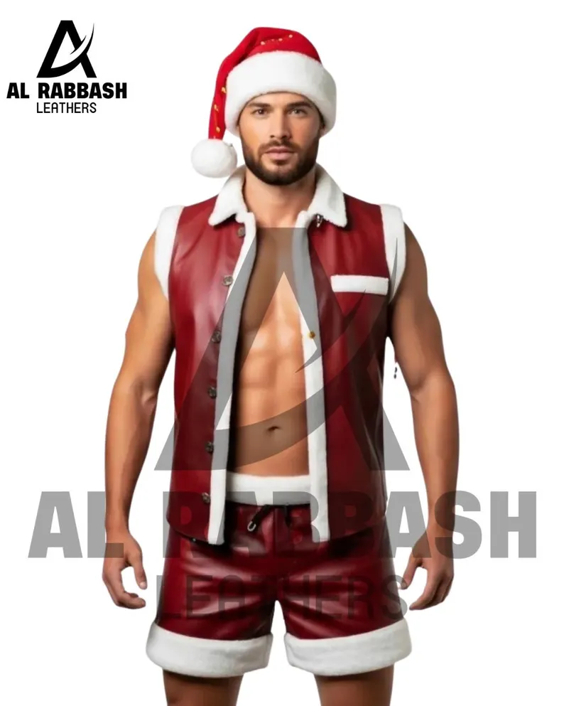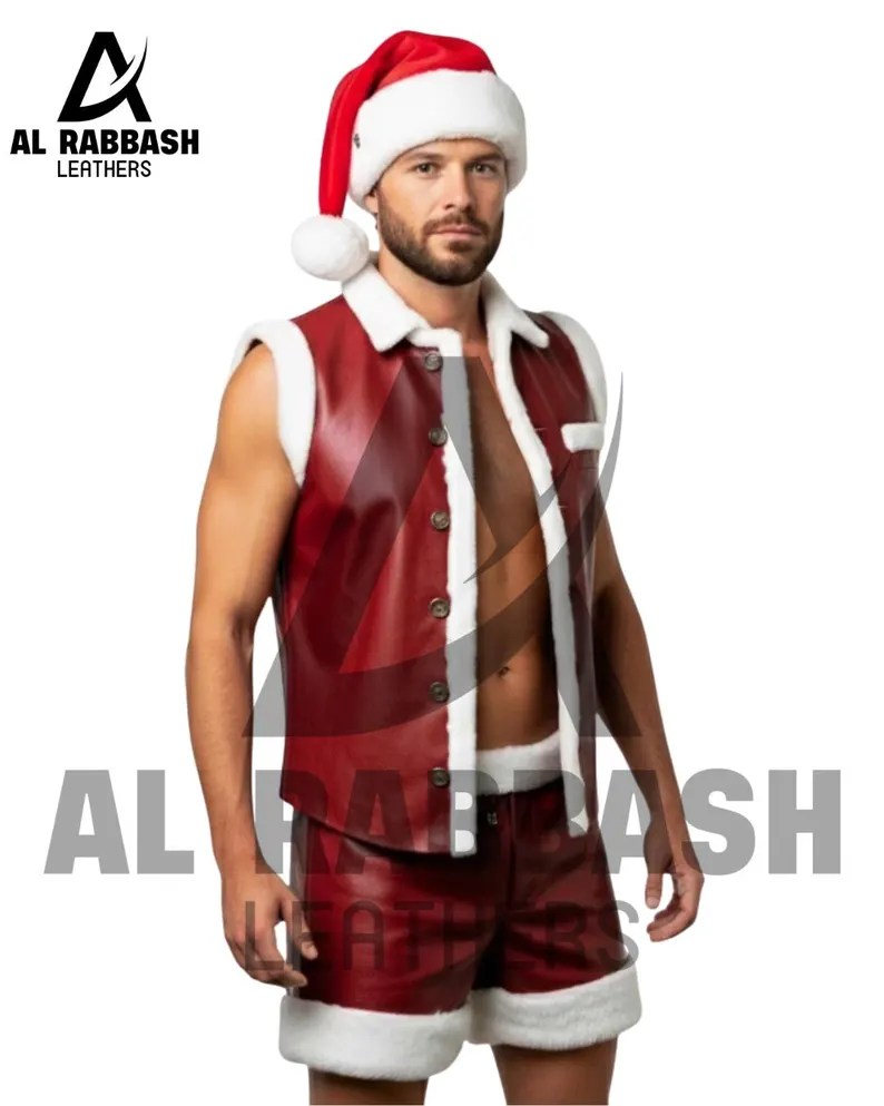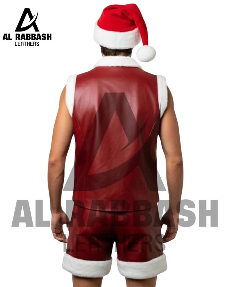 This set includes a tailored vest and matching shorts, providing a festive, coordinated look. The high-quality leather construction ensures durability, while the maroon color adds a rich, seasonal touch. Reinforced stitching guarantees longevity, making this outfit both practical and eye-catching.