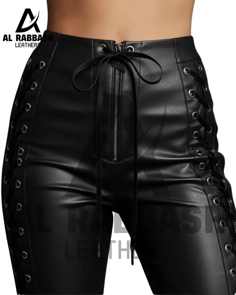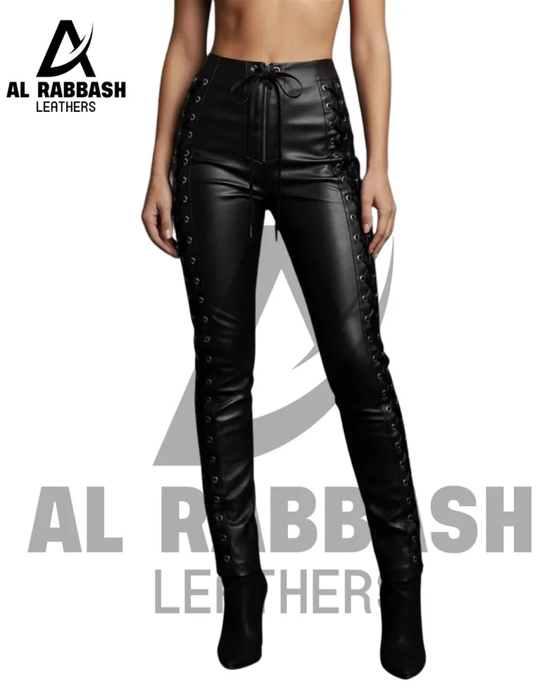 The high-waist skinny fit design enhances natural curves while providing a modern and elegant look. The lace-up detail adds a bold and stylish element, allowing for adjustable comfort and a customized fit. Reinforced stitching ensures strength and durability, while the premium lambskin leather develops character over time.