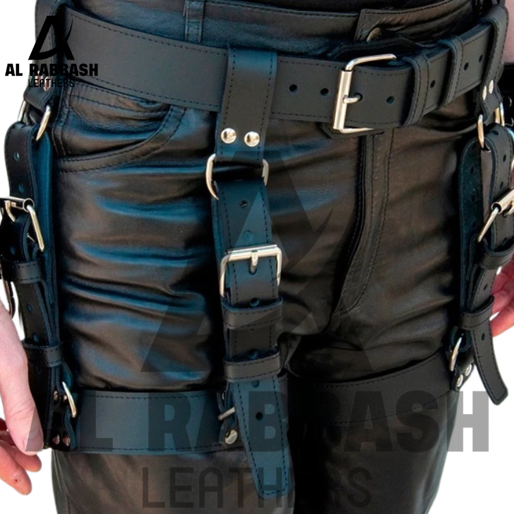Handmade from premium genuine leather, this waist and thigh harness features an adjustable fit that contours naturally to the body. Reinforced stitching and solid metal hardware provide strength and reliability, while the locking cuffs add a distinctive, refined finish. The smooth leather texture and structured design reflect skilled artisan work and timeless leather artistry.